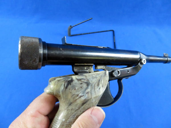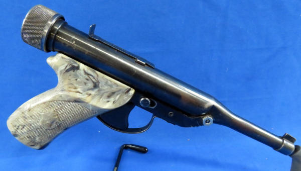 top barrel breaks away from frame to pump gun; shell enters from the back of the gun; factory grips; neat piece; SN#841559