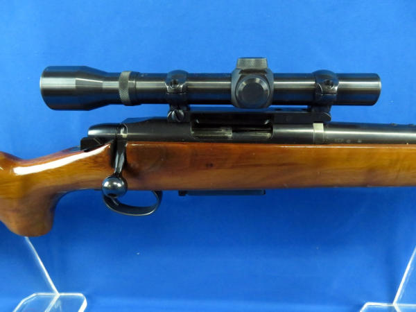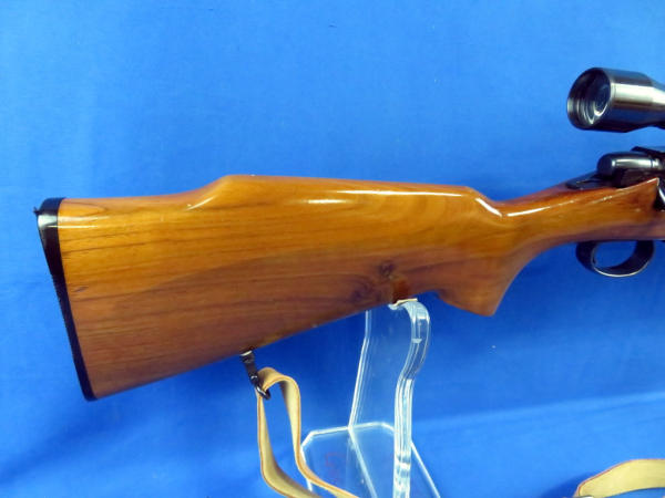 22" BBL; action is good but catches just alittle; wood is very nice; leather sling; clear Weaver scope; removable magazine; SN#020478
