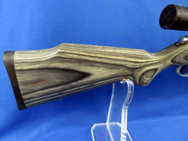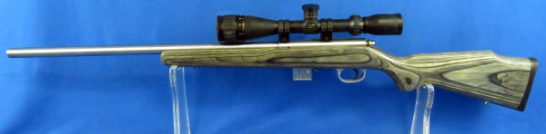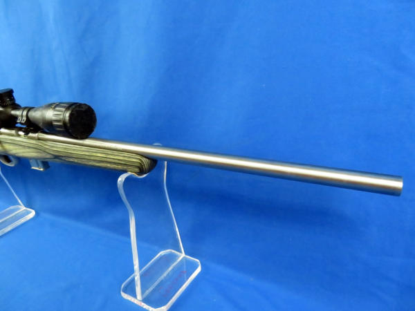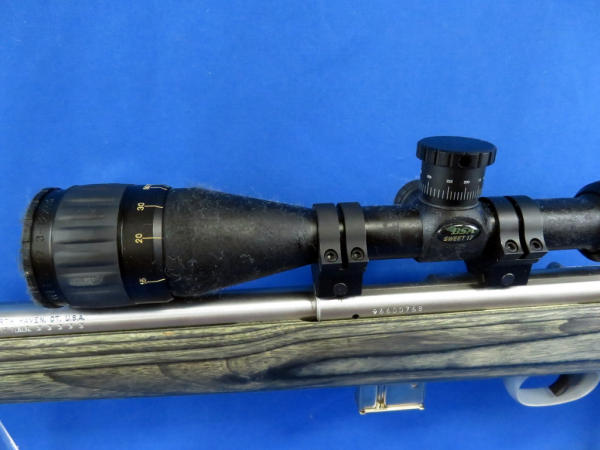 22" Stainless barrel; smooth action; removable magazine; BSA Sweet 17 scope; wood grain laminate stock; has a very sticky residue on scope; SN#96600768