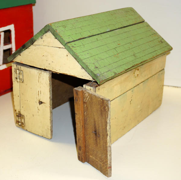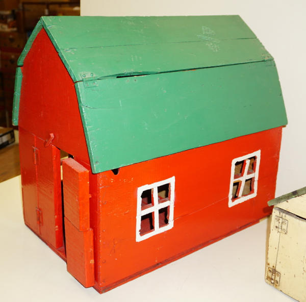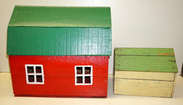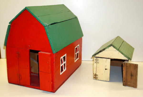 old folk art toys, barn is 20" long and 17" tall, both to go for one bid