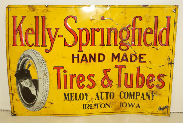 19.5"x14", super graphics with the lady in the tire, pretty heavy wear, dings, bends & paint loss, but still a super scarce sign, rates 7 condition; this sign was found tacked up in a barn in the Ireton, IA area