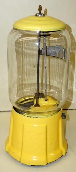 really nice original yellow porcelain coated over cast iron base and lid, original glass globe, has some chips on the top, original label is a little worn, 16" tall, has the key