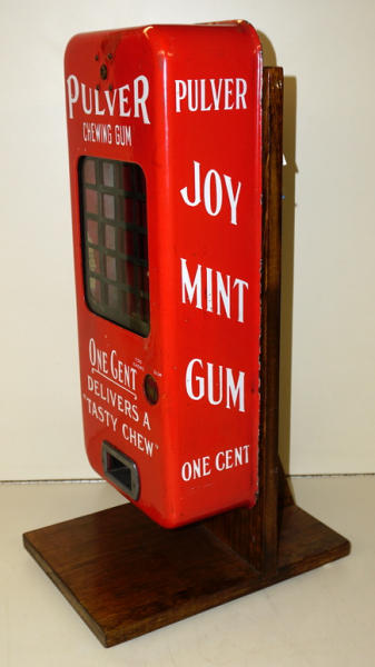 classic machine, has some touch ups in the porcelain, but not bad, 20" tall, mounted to a wood stand for display, neat piece