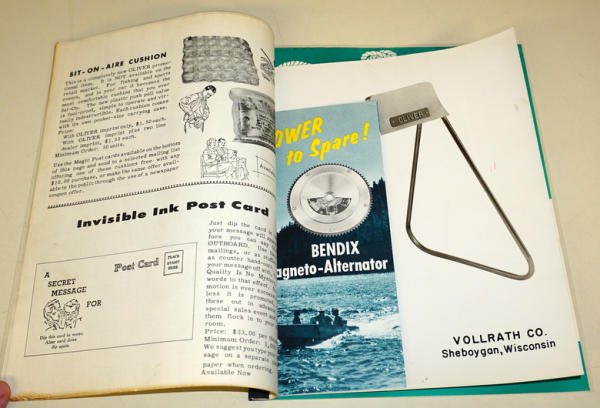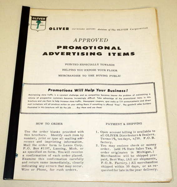 about 12 pages, includes order forms for matchbooks, lighters and other smalls; has a B&W photo of the Outboard motor stand, all in clear plastic folder