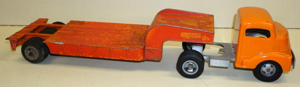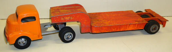 Cab has been repainted, trailer is an old repaint that needs to be redone, open axle on the back of the trailer variation, good project