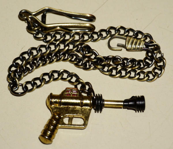 I think the gun is old original piece on a newer chain, 2" long