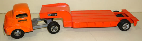 cab is nice original, trailer is repainted, but a darker orange, open axle on the rear of the trailer