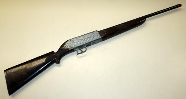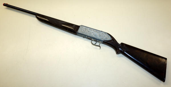 plastic, not sure if it's a cap gun or just a toy gun, 36" long, plastic, has fairly heavy wear
