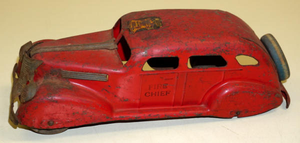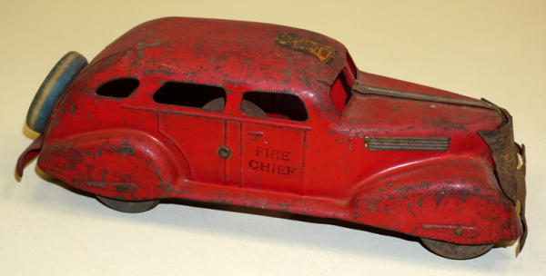 10.5" long, wood wheels, paint is about 70%, decal is tough on the top, unusual toy for the pressed steel collection