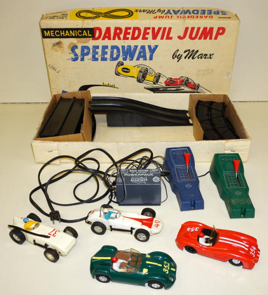 includes 4 cars, not sure if they are all correct for the set or not, box has some damage, not sure if complete or not