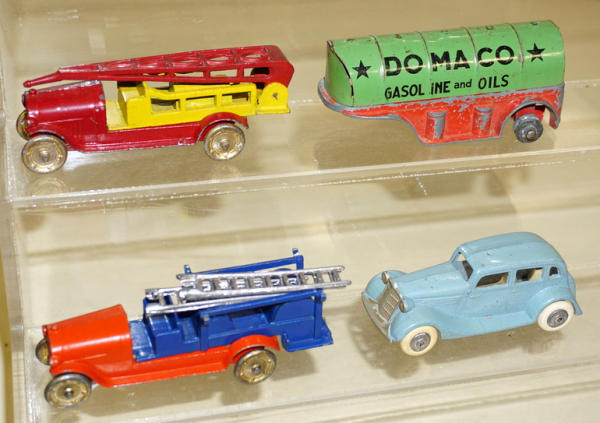 Fire trucks are about 3.75" long and both nice originals, sedan I think is restored, trailer is good, but no truck, all to go