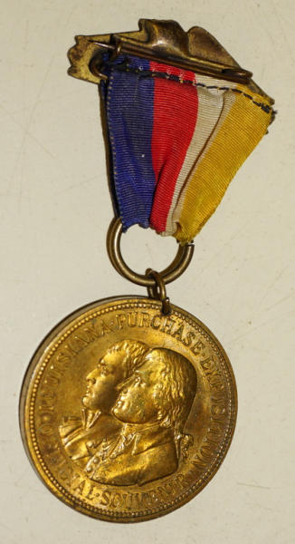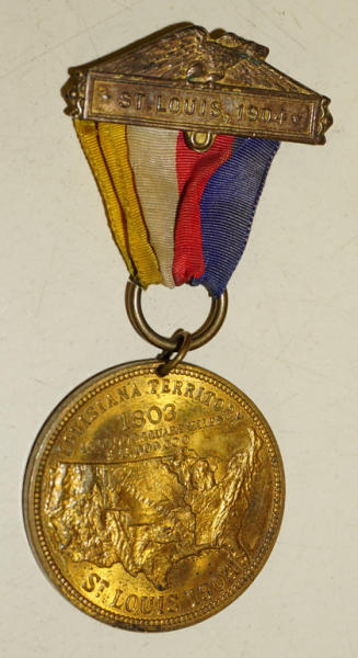 1 3/8" medallion, pin at the top says St. Louis 1904, nice original, ribbon is aged