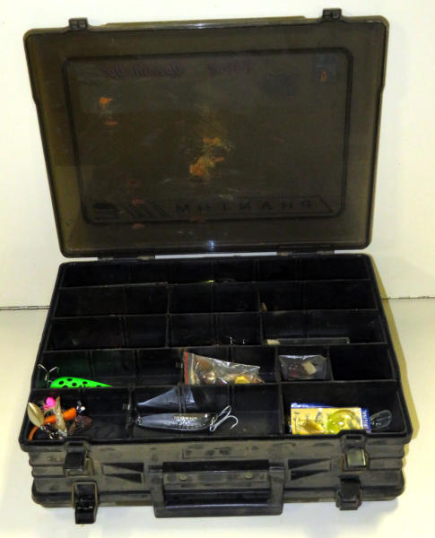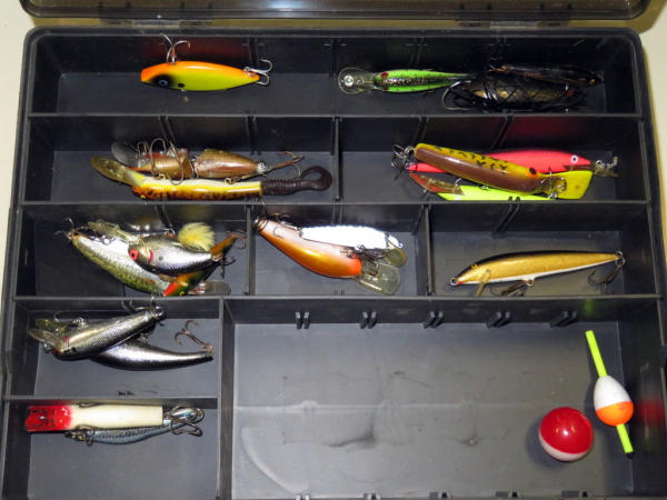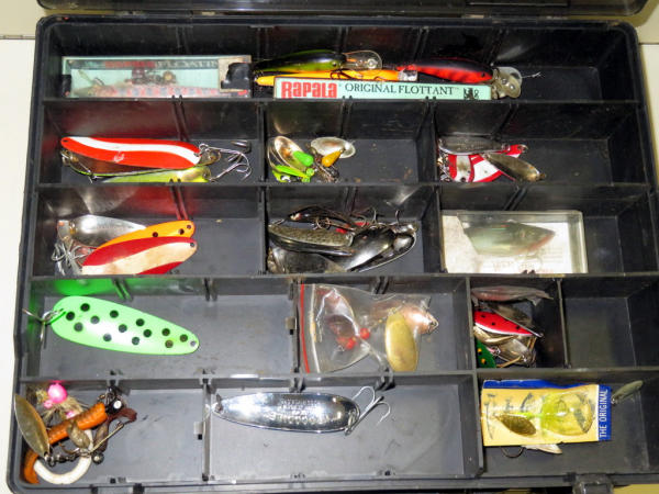 includes several crackbaits, spoons and other hooks; buying the whole family; tackle box could use a cleaning but in good shape