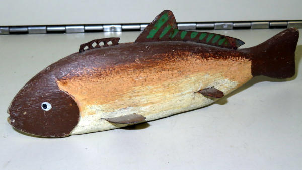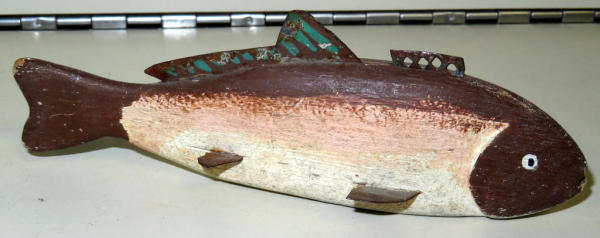 hand made of wood w/weights added to bottom; metal fins; nice look; 6" long