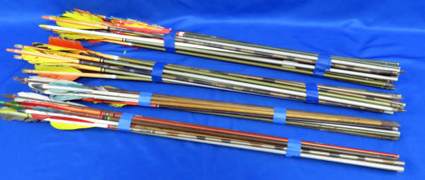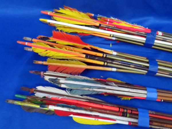 most have quite a bit of wear; most aluminum but a few wood; 55+ in all; feathers are worn; sell for one money