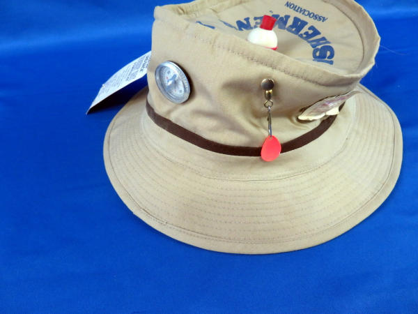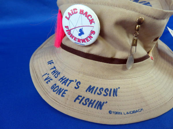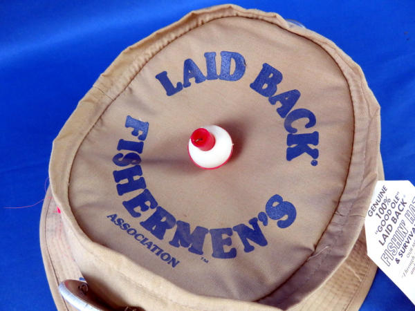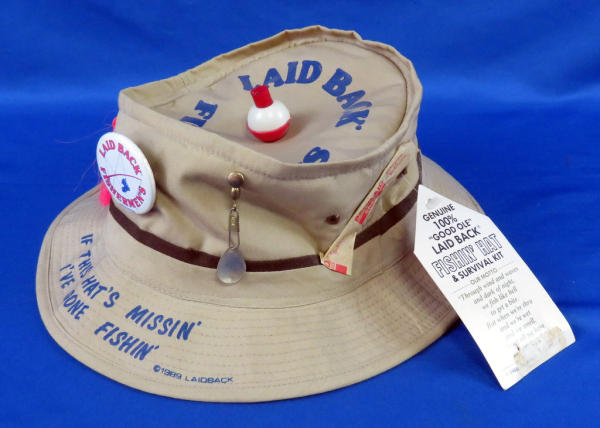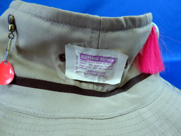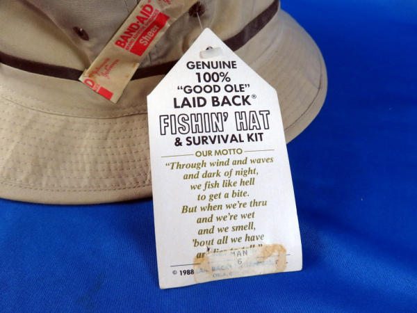 NOS; still has hang tag; has some dust staining; has band-aid, aspirin, compass, spinner & more attached; made in 1989; neat old bucket hat!