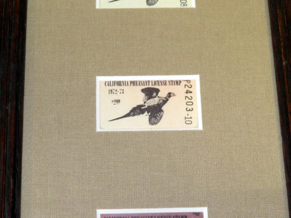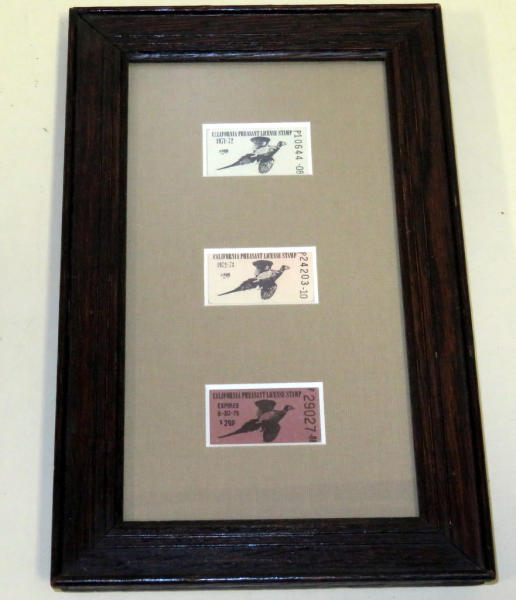 three stamps mounted and framed; includes a 71-72, 72-73 & 1975; frame is 10.75" x 6.75"