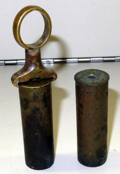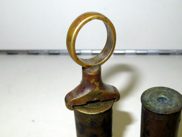 unique tool to set the primers on your brass shell casings; includes two brass casings; no marking other than a couple numbers on the bottom of the tool; never seen one before