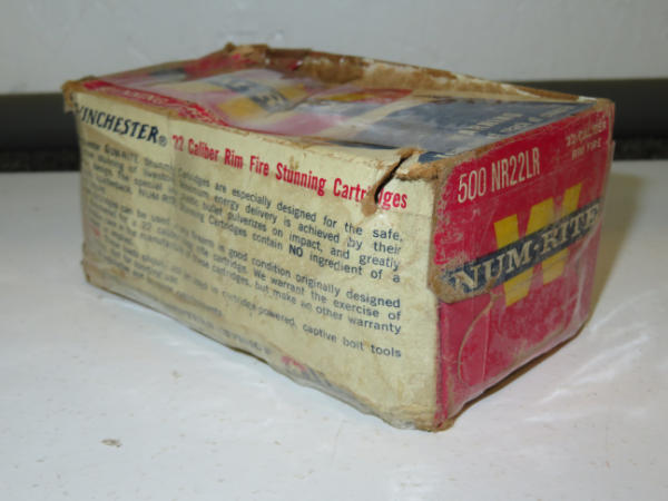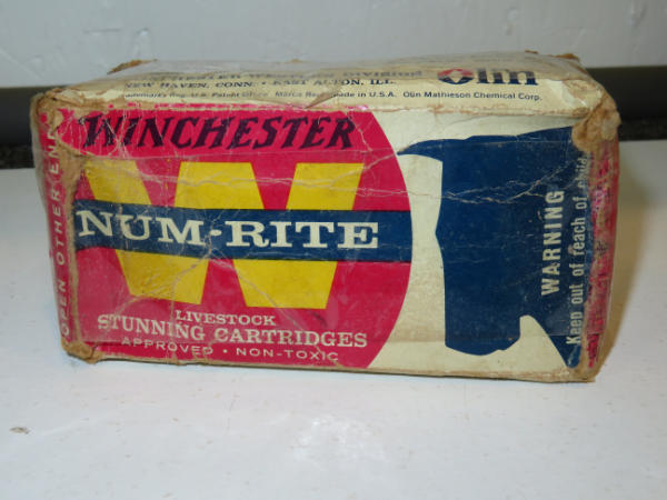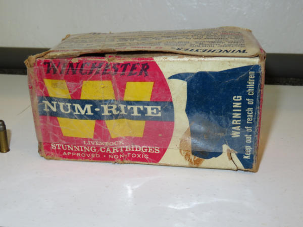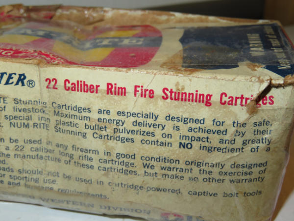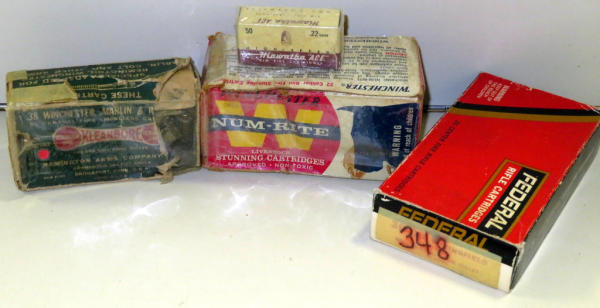 This lot includes a partial brick of extremely rare Winchester Stunning Ammo, they have a specially designed head w/an iron & plastic bullet to stun livestock! Extremely hard to find! Winchester .22LR brick has probably 250 rounds; Hiawatha .22 Short is full but box is faded; Rem .38 Win, Marlin & Rem box is very rough and has about 10 rounds; .348 has 2 rounds and 17 brass; sell all for one money