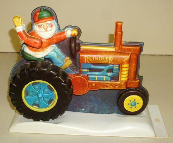 13" long, light plastic, mechanical, but was wired direct so can't test; I believe this was part of a Hallmark display