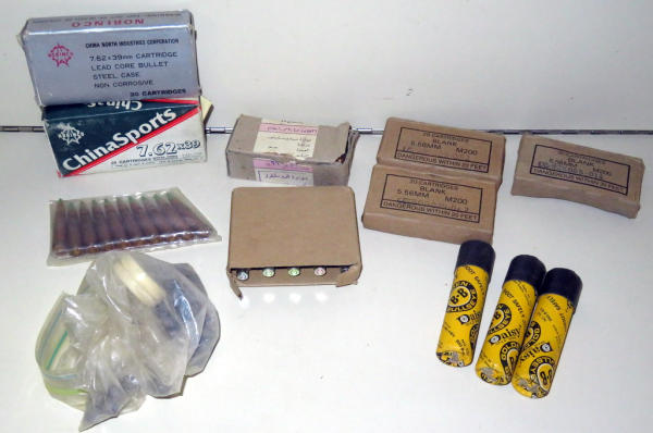 includes some 7.69x32mm; 5.56mm blanks, BBs; CO2 Cartridges and more; sell for one money; ammo can not ship USPS