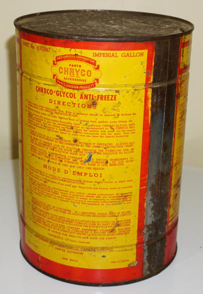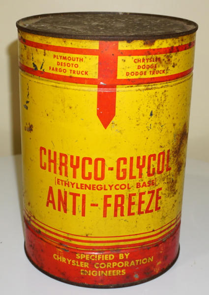 heavy wear, advertises Plymouth, Desoto, Fargo Truck, Chrysler, Dodge & Dodge Trucks; about the same size as a 5-quart can, unique