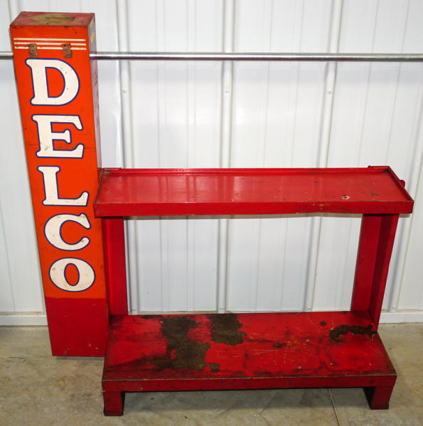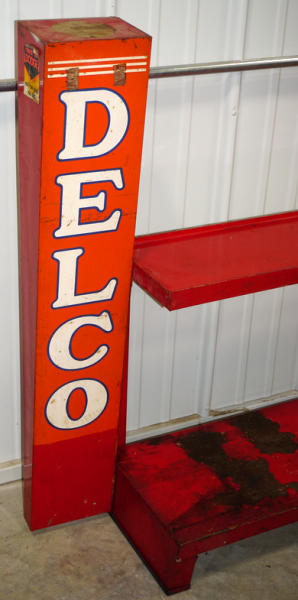 43"x42", used, will come apart so it is shippable, but local pickup would be better, faded on the sign part, has heavy paint loss on the bottom shelf and needs cleaning