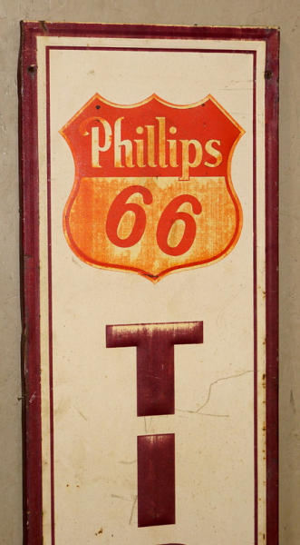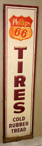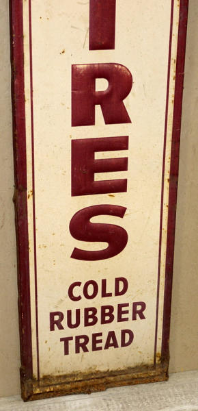 17"x72", wood back, sat in the dirt and rusted on the bottom, faded, rates 7 condition