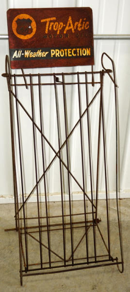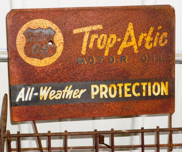 heavy wear, sign is very rust and has a hole through it, still a nice display rack for cans, 33"x16"x16"