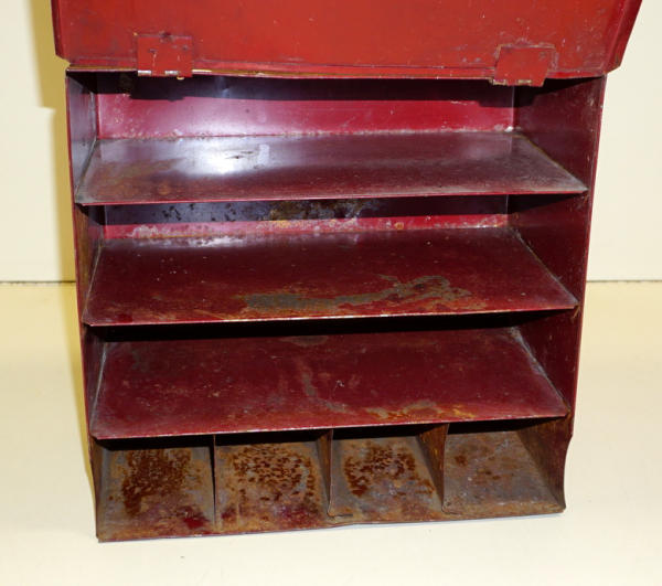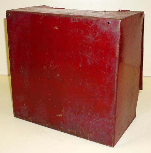 12"x12"x7", fairly heavy wear, door is a little bent, rates 7 condition