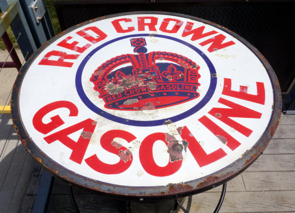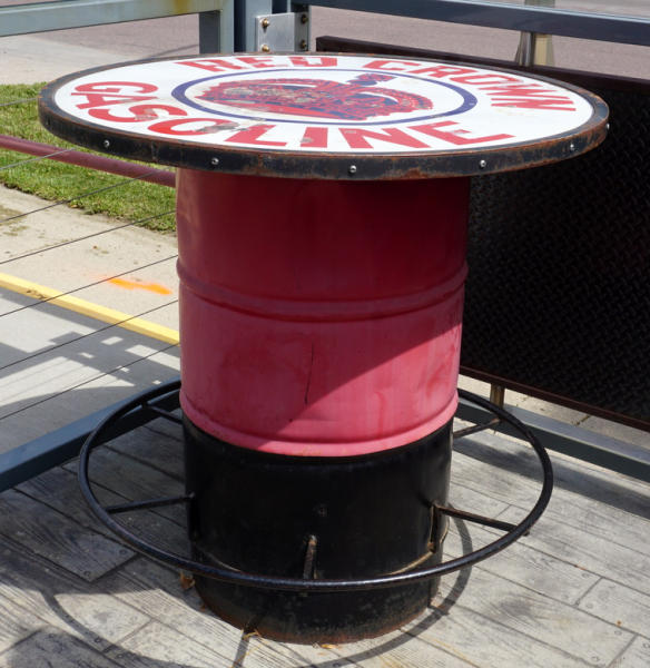 55-gal barrel for the base, sign has a heavy steel ring around the side, wood on the back, so can't tell if it's double sided or not, has some large chips, but good color, might have a layer of clear coat on it too
