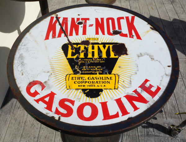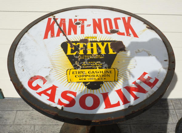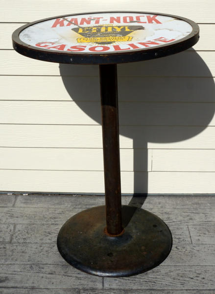 sign has some large chips and has a clear coating put on it, made into a bar-stool high pub table, but doesn't look like the sign was damaged to make into a table, has wood on the bottom, so can't see the other side, neat piece for your sign man cave!; pickup in Fargo only