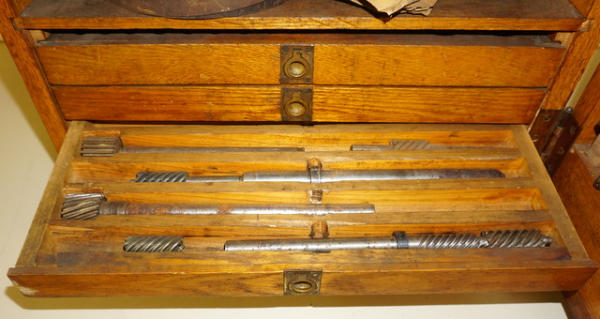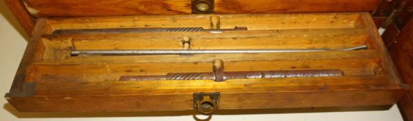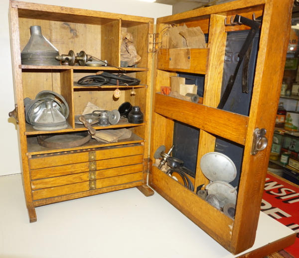 26"x17.5"x11", oak case is really clean and nice, some chips on the edges; sign has completely faded out from age; unique part is that is plumb full of NOS DeLaval parts! Very heavy, prefer not to ship, local pickup would be preferred