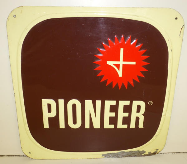 18"x18", has large spot of paint loss on the bottom edge, otherwise good color, rates 7.5 ; this was Pioneers "Red Comb" Chicken Feed logo