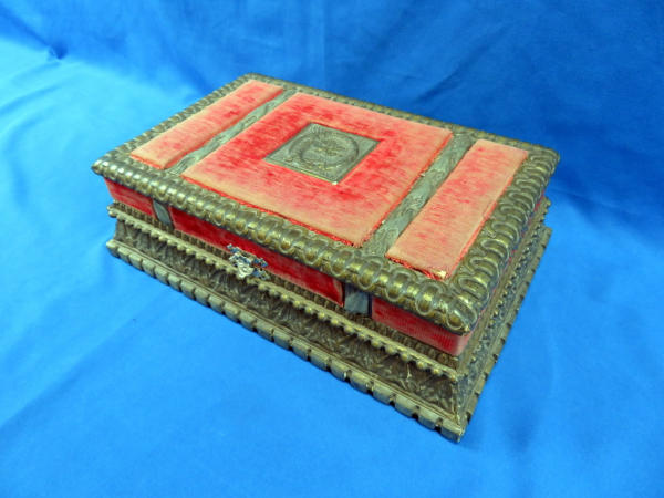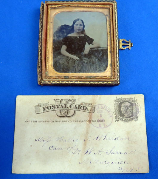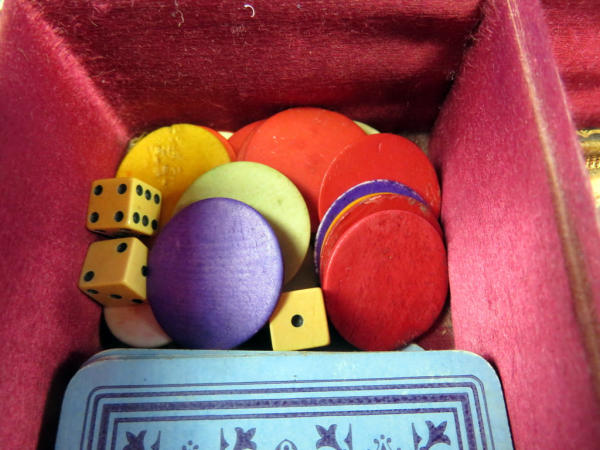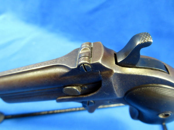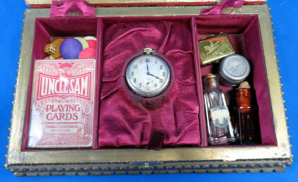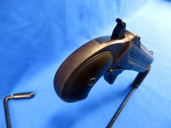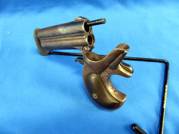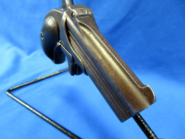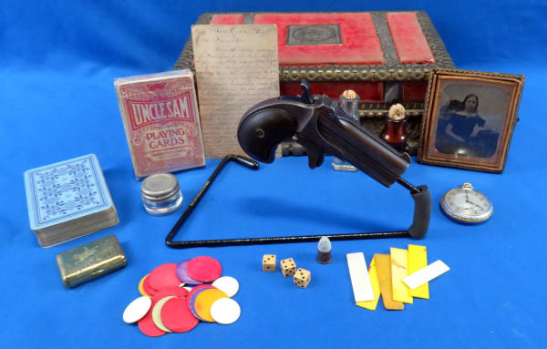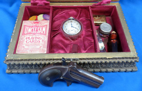 Believe this could have been a rare special order to be a .38cal, nearly all M.95s were issued as a .41 Short.; top Rib address of "Remington Arms CO. Ilion, NY"; has one broken hinge; 3" O/U Bbl.; checking on grips are pretty worn; Missing the firing pins; spur trigger; comes in a vintage powder box w/a deck of cards, chips, dice, perfume bottles and more; very neat set and would make a great display; has a B&W photo of a young woman along with a letter from her parents talking about a trip they took up the Hudson River on a large fancy boat...dated 1877! SN# on gun is 328