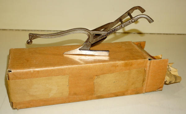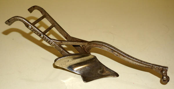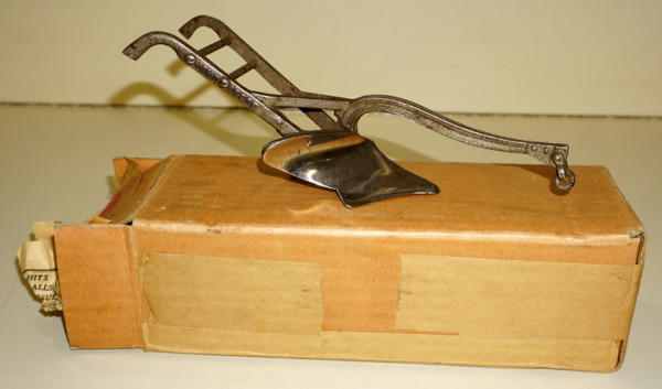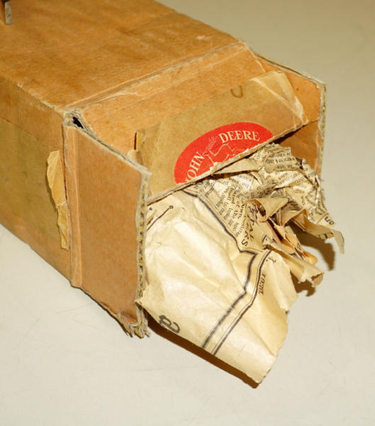 12" long, cast iron with original nickel finish, finish has some wear; comes with a never seen before original brown box with red JD decals on each end, original 1930 Chicago Tribune newspaper inside that it was packed in! Great piece