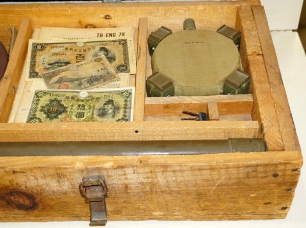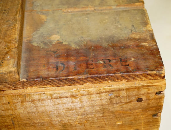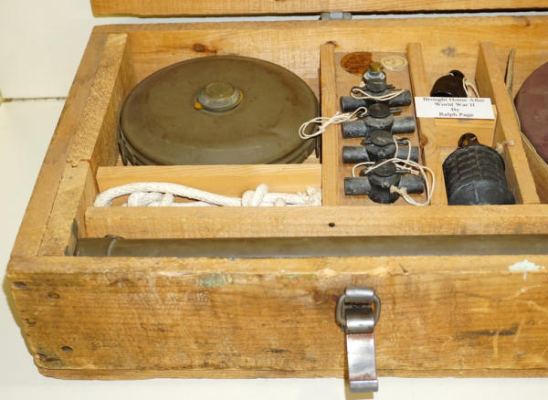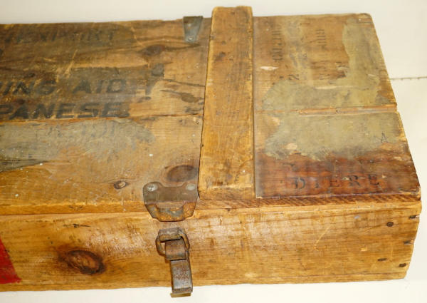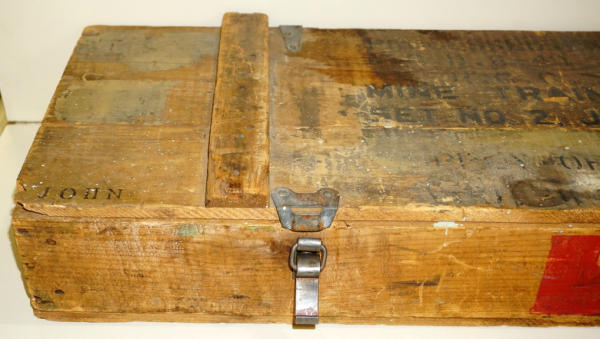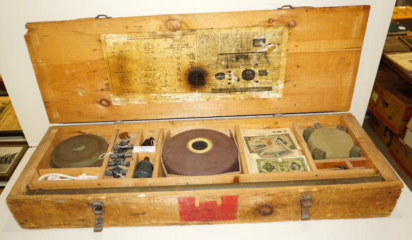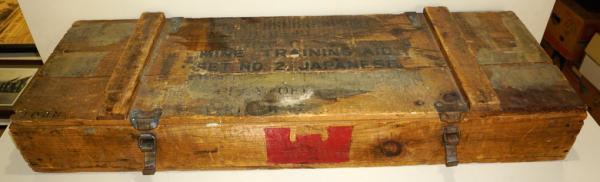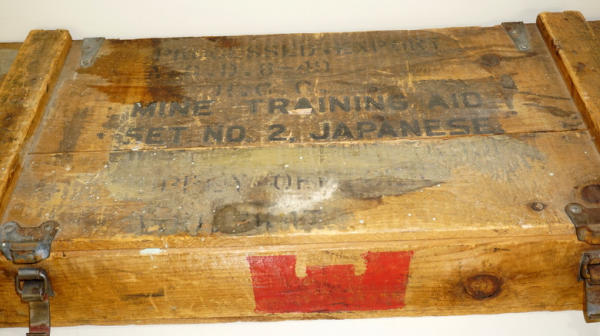 issued to battalions during WWII to train for land mine detection; this one was issued to the John Deere Battalion and has stenciling on the box to mark it; looks to be complete and really nice; comes in a 39"x13.5"x6" wood crate with original instructions; originally from the Dale Lenz collection; probably a 1 of a kind piece