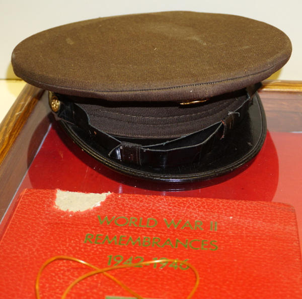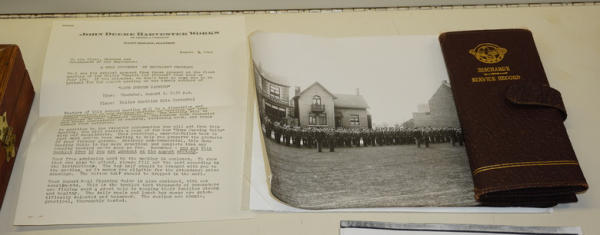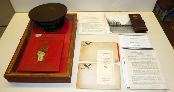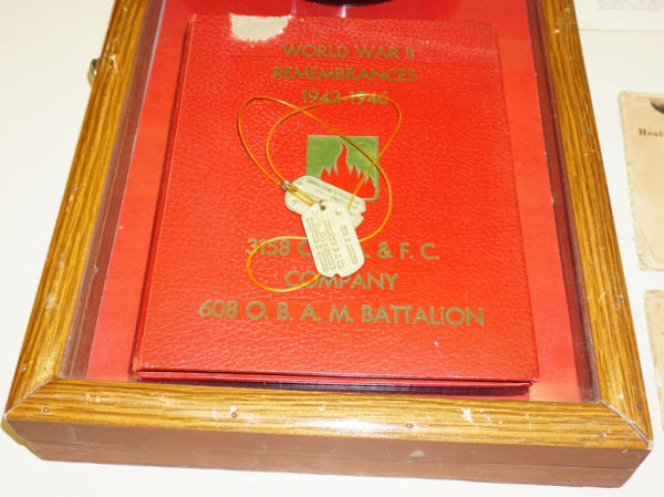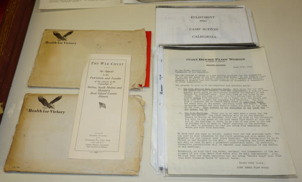 all in a showcase, the leather folder is printed inside "Thank-you for your service, John Deere Plow Co.", Dog Tags are Donald Halstead of Brandt, SD; various other pieces of ephemera all included; all related to the John Deere Battalion or employees of JD that were serving, includes a showcase for display, all to go