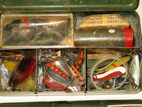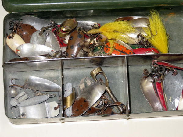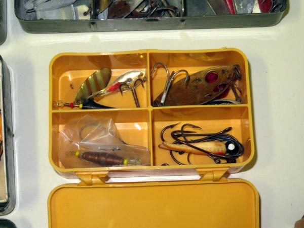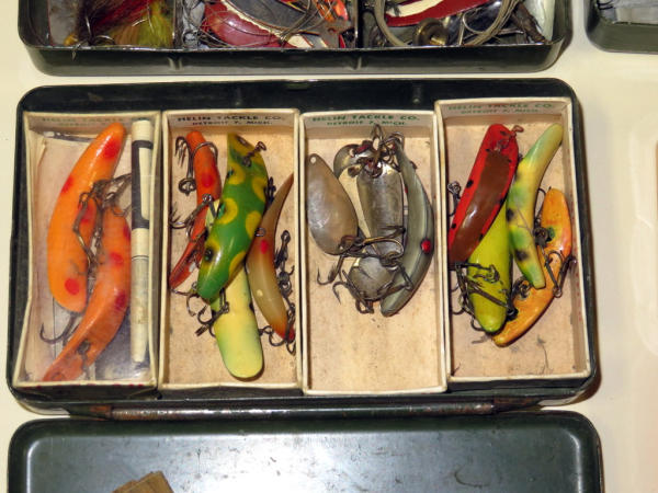 all small baits; three boxes are tin "Pocket Tackle Boxes", one is plastic; sell for one money