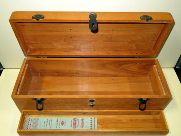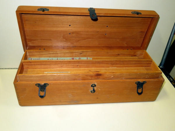 has two removable trays; no makers mark, may be handmade; leather handle; 21" long