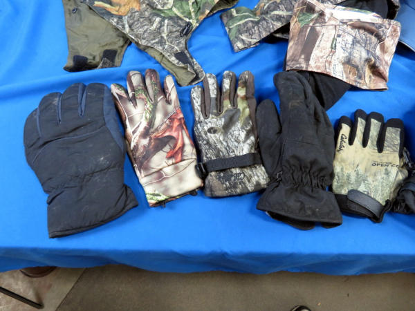 all gloves are singles, no matches; couple jacket hoods that didn't go with any previous coats; hats, mask; w/RMEF duffle bag; all for one money