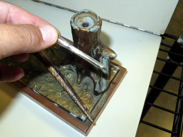 not positive, but believe the one w/stump is some kind of lighter; door stops are cast iron and lighter is cast aluminum; all heavy; some paint flaking on lighter; biggest one is 11" tall; sell for one money