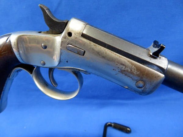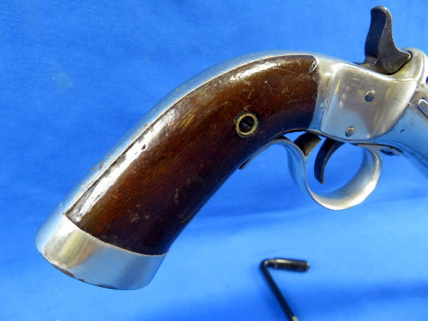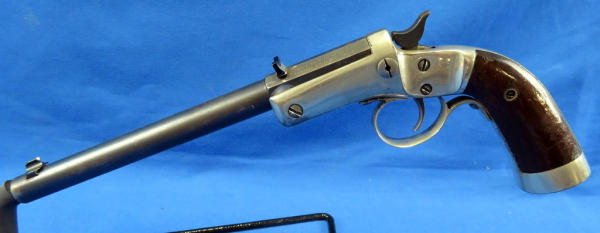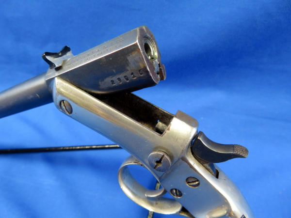8" round to Oct. breach BBL; action is good but extractor does not want to move; bluing is thinning on barrel; Nickel finish frame; full trigger w/trigger guard; wood grips; made in USA; SN#29016