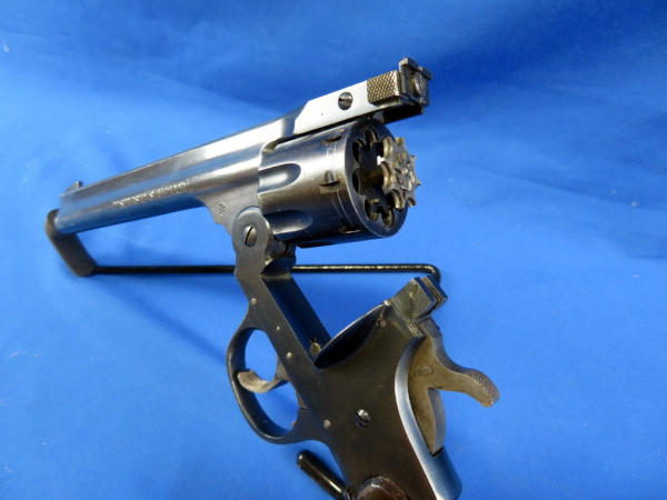6" BBL: top break action is smooth; 8-shot cylinder; wood Target grips; bluing has some thinning and a few scratches; made in USA; SN#D32361