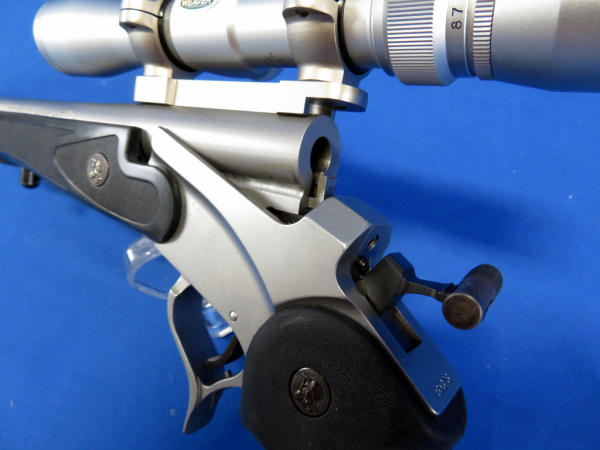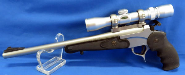 15" Stainless barrel; easy break action; been fired but nice condition; come w/soft padded case; Weaver Classic VH-8 Scope is clear; black synthetic forearm & grip; made in USA; SN#S5376