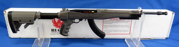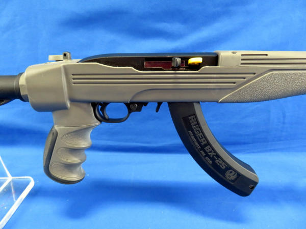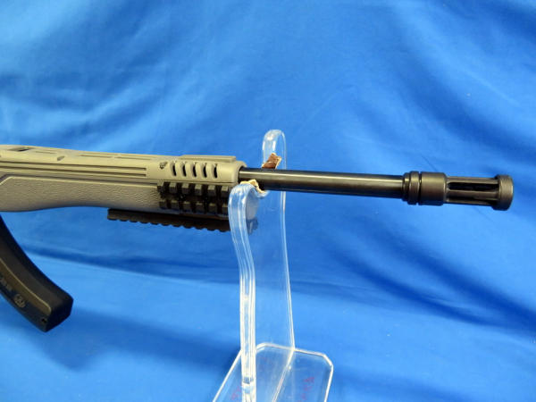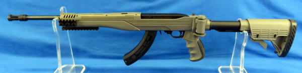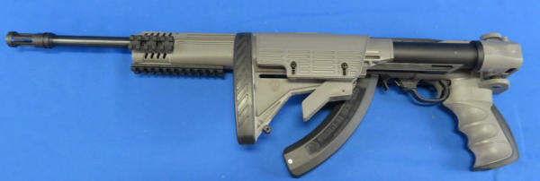 16" BBL w/2" muzzle break; extendable stock w/pistol grip; stock folds; banana clip; original box; appears mint & unfired; grey synthetic stock; made in USA; SN#824-16557