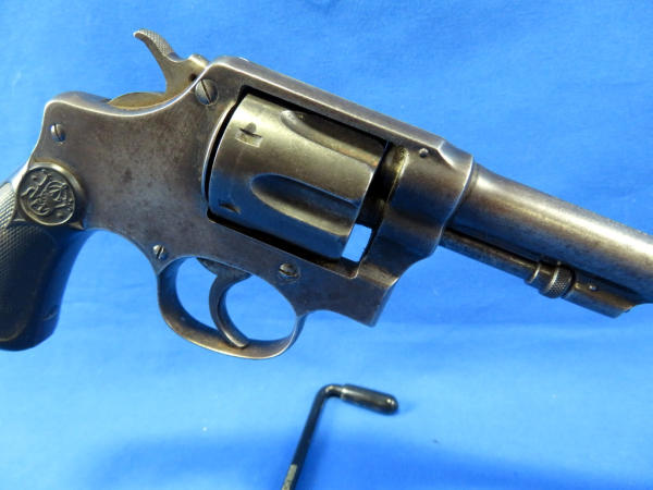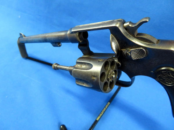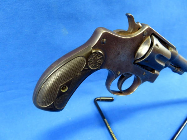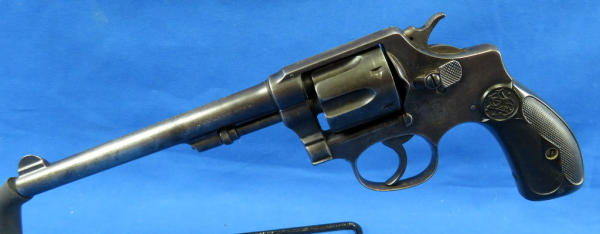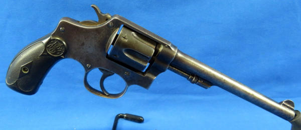 Model of 1903 2nd Change; 6" BBL; bluing is thin; factory hard rubber checkered grips; 6-shot swing out cylinder; made in USA; SN#92422