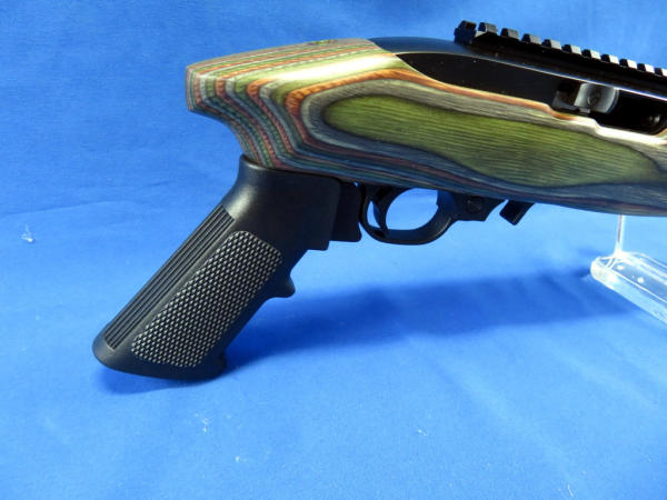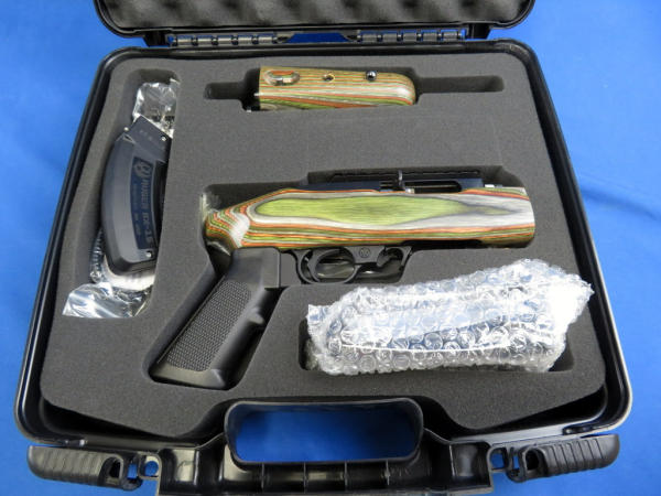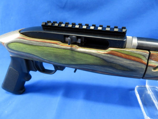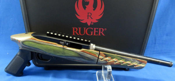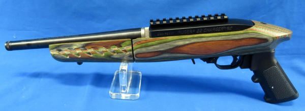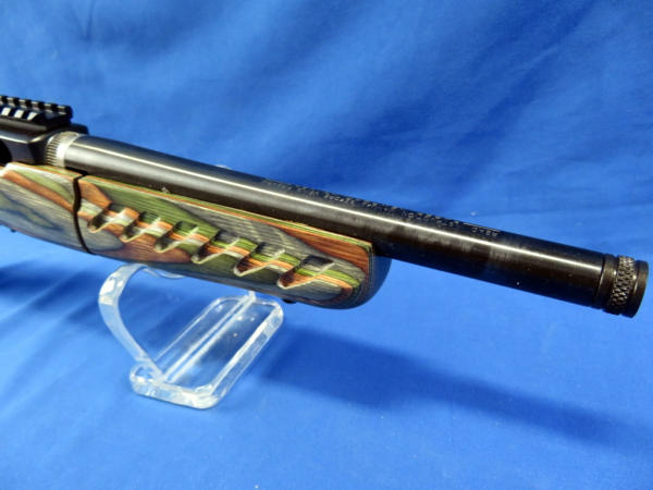 9" BBL; comes apart in two pieces; green wood grain laminate stock; factory case w/banana clip & bi-pod; appears mint & unfired; made in USA; SN#490-70111