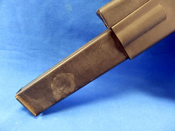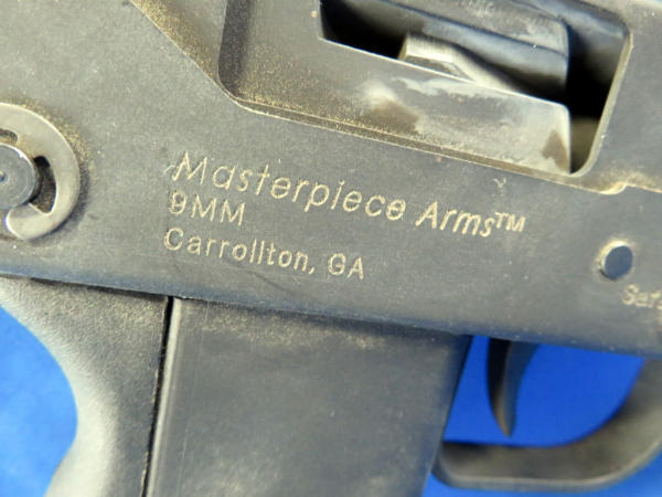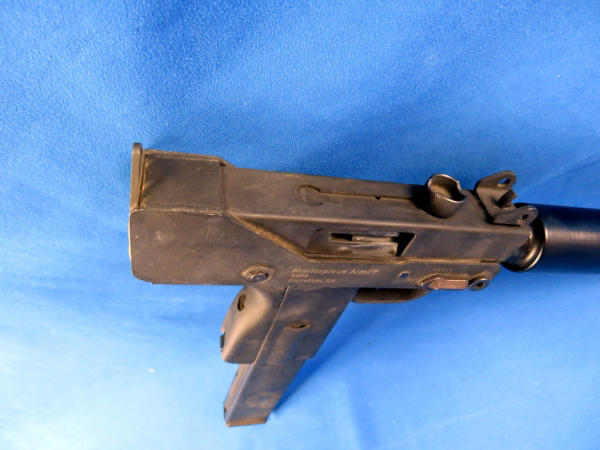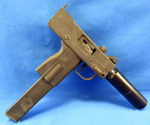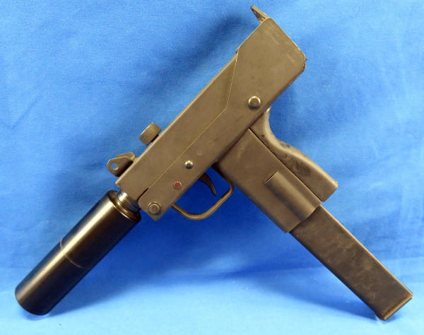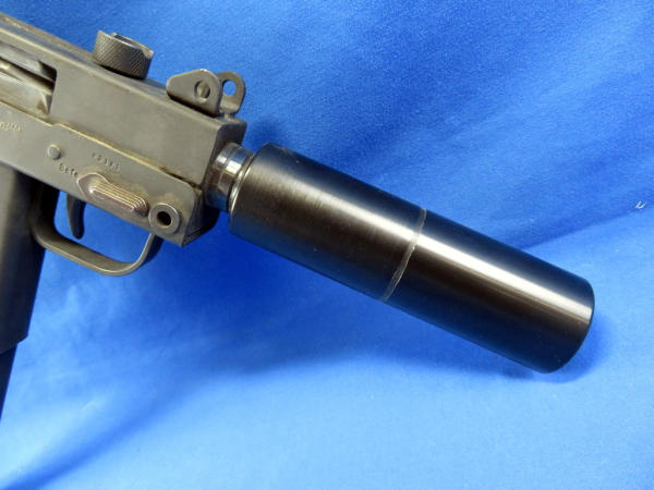 7.5" BBL; this IS NOT a silencer, just made to look like one; has extra long magazine; no model number on gun; has some scratches; flat black finish; heavy; made in USA; SN#F2171