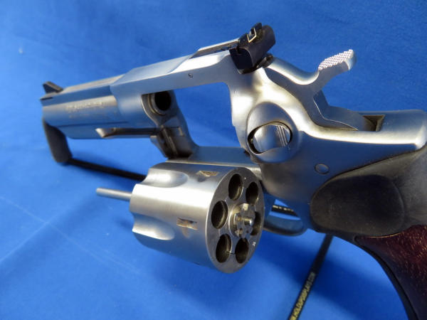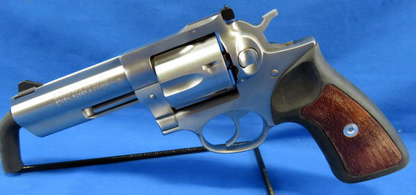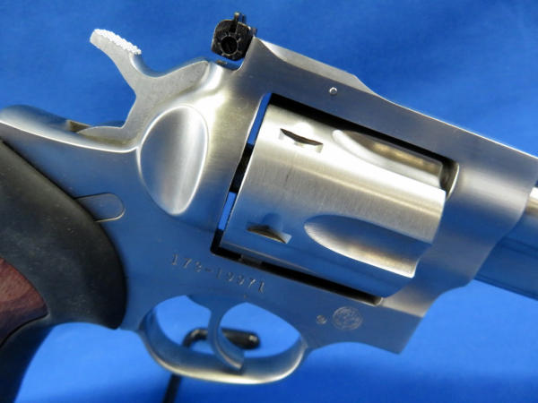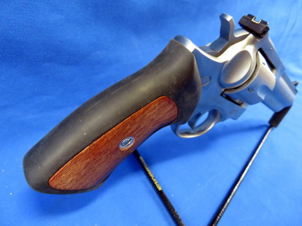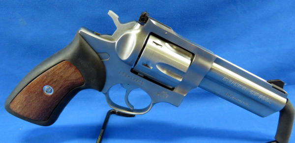 4" Stainless barrel; wood & rubber grips; 6-shot swing out cylinder; rear white outline sight; made in USA; SN#173-19971
